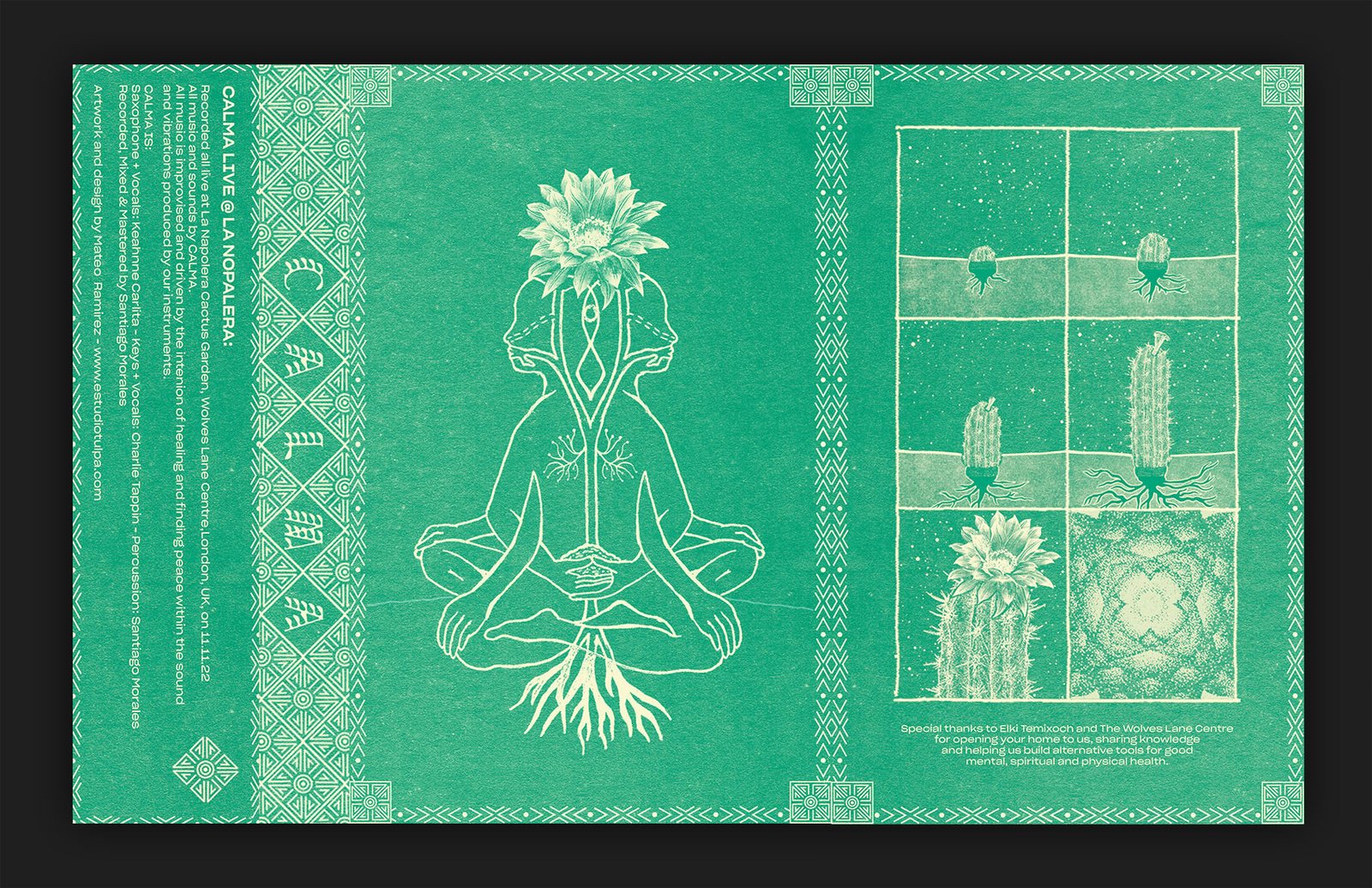 CALMA es un trío de ambient de Londres. Para su primer lanzamiento, grabaron una sesión improvisada en vivo en La Nopalera Cactus Garden donde Elki Guillén investiga los cactus como un cultivo alternativo para sobrevivir a la crisis climática. Elki le pidió al trío que llevara música a sus plantas, ya que puede actuar como nutriente para ellas. La banda creó un estado meditativo para los cactus a través de las frecuencias de su sonido y quiso compartir la misma experiencia con personas que no estaban allí a través de un casete y de animaciones.
